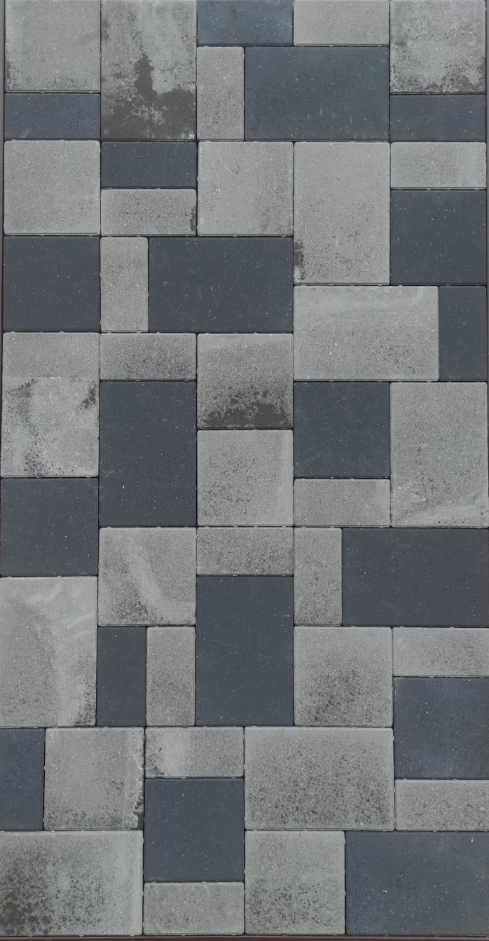 Тротуарная плитка "Новый город" представляет собой комплект из 3-х камней (размеры 200х200х60 мм, 200х10х60 мм, 300х200х60 мм), которые при укладке комбинируются между собой.